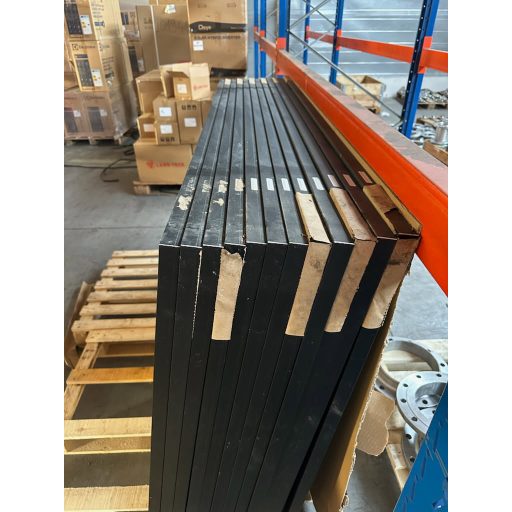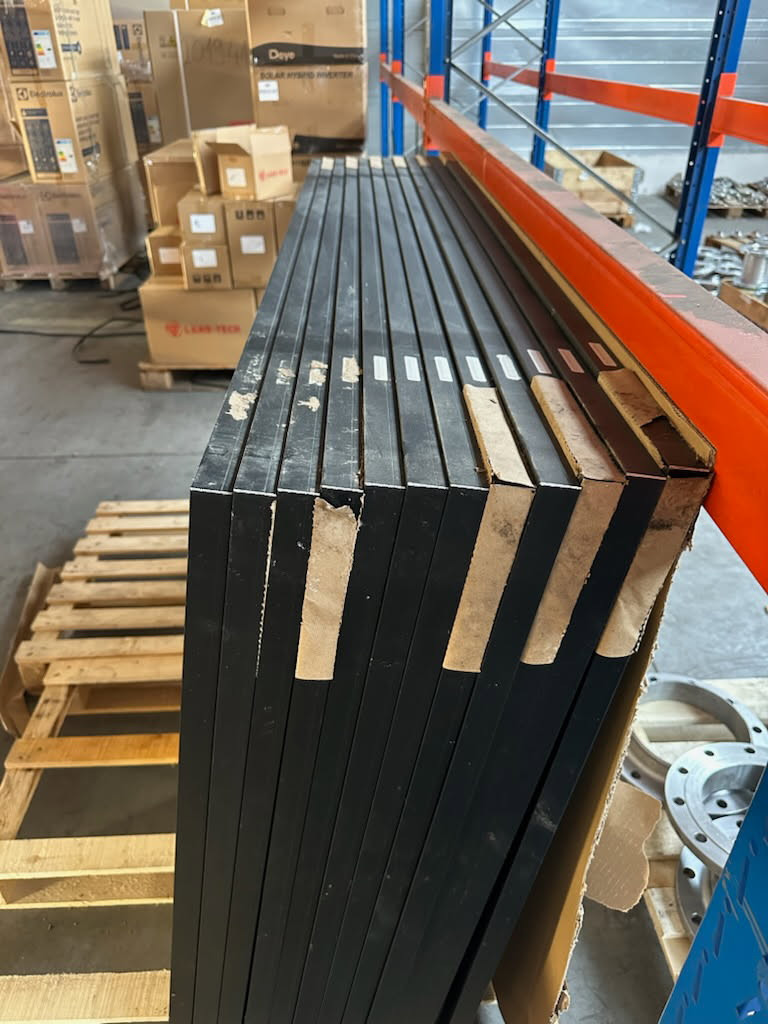 A napelem panelek sérülésmentesek, szabad téren tárolt raklapokon voltak. A gyári csomagolás elázott, a papír részben rátapadt a panelek alumíniumkeretére.